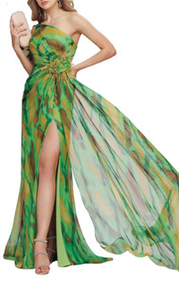 This strapless green cocktail party dress is designed to make a statement at any event. Crafted from luxurious chiffon, this gown radiates sophistication with a touch of playful charm. It is perfect for prom, wedding guest dress, or as a bridesmaid dress. The deep front slit adds a hint of daring allure, allowing for graceful movement and a captivating silhouette. The gown’s show-stopping centrepiece is a stunning flower and feather brooch, meticulously placed to draw attention and add a unique touch. Embellished with shimmering stones, this brooch brings a dazzling sparkle that complements the soft flow of the chiffon. The gradient of green and yellow hues meld beautifully, creating an enchanting color palette reminiscent of a vibrant spring evening. This strapless design offers a flawless fit, highlighting the shoulders and neckline, while the light, airy fabric ensures comfort throughout the night. With its timeless yet striking details, this dress is perfect for those who wish to blend elegance with modern flair. Have Questions about us, read our FAQ