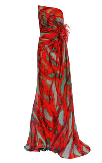 This strapless red print party dress is designed to make a statement at any event. Crafted from luxurious chiffon, this gown radiates sophistication with a touch of playful charm. It is perfect for prom, wedding guest dress, or as a bridesmaid dress. The deep front slit adds a hint of daring allure, allowing for graceful movement and a captivating silhouette. The gown’s show-stopping centrepiece is a stunning flower and feather brooch, meticulously placed to draw attention and add a unique touch. Embellished with shimmering stones, this brooch brings a dazzling sparkle that complements the soft flow of the chiffon. The gradient of green and yellow hues meld beautifully, creating an enchanting color palette reminiscent of a vibrant spring evening. This strapless design offers a flawless fit, highlighting the shoulders and neckline, while the light, airy fabric ensures comfort throughout the night. With its timeless yet striking details, this dress is perfect for those who wish to blend elegance with modern flair. Have Questions about us, read our FAQ