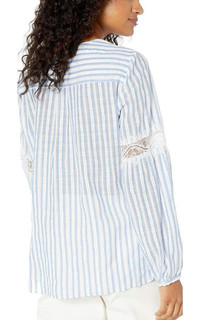 Our signature high-low top in airy cotton stripe is accented with a faux wrap bodice, full sleeves, and ornate lace trim. Pull On closure Machine Wash V-neck neckline Long puff sleeves Buttoned cuffs Fabric Self: 100% cotton stripe Trim: 100% nylon lace Color: Blue Combo