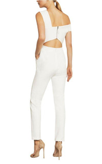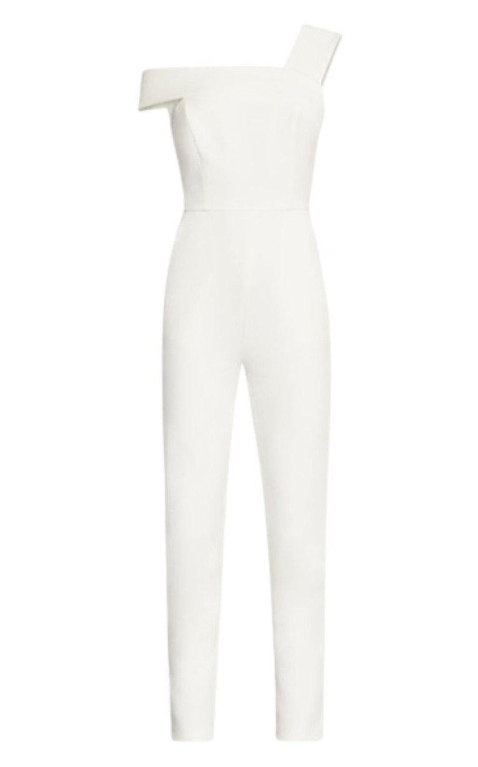 One-shoulder neckline; Hidden center back zipper and hook-and-eye closures. Back cutout. Slash pockets. Polyester/spandex; crepe de chine lining: polyester. Machine washable. Color: white True to fit