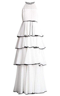 ZAC Zac Posen "Alexandria" gown in chevron mesh with contrast detail. Grecian neckline with strapless illusion; rouleau-button back. Sleeveless; cut-in shoulders. Cord belt at Empire waist. Tiered A-line silhouette. Back zip. Polyester. Dry clean.