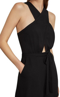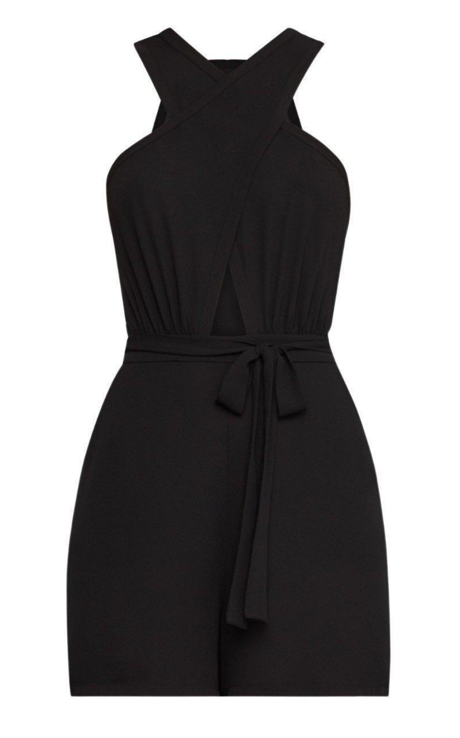 A crisscross bodice accented with a front cutout and slit back boost the sultry style of this wide-leg halter romper. Halter neckline Hidden center back zipper Button, and hook-and-eye closures Adjustable waist ties Crisscross bodice with front cutout Silk georgette: polyester Approx. inseam: 3-1/4" Rise: approx. 14-1/4"; leg opening: 26" Machine washable