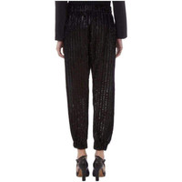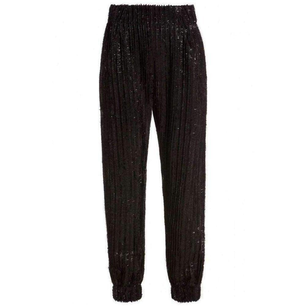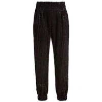 Trousers simply pull on, secured with an elasticated waist. High-waist fit with elasticated waistband, front pocket detailing, tapered leg, elasticated cuff, medium-weight polyester-blend fringe lined fabric. Dry clean only. 63% Polyester, 37% Viscose, detail 95% Lycra, 5% Lycra.
