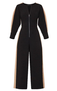 Inspired by vintage boiler suits and utilitarian style, this BCBGMAXAZRIA one-piece is your easiest outfit ever. Features long cuffed sleeves and athletic-inspired stripes at the sides. Long cuffed sleeves Split neckline; exposed front zipper closure Striped at side seams Approx. inseam: 23" Material: 63% Polyester, 32% Rayon, 5% Spandex Machine washable