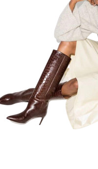 Made in Italy, these tall boots are crafted in lizard-embossed leather. The to-the-knee silhouette is stylized by the sleek pointed toe and covered stiletto heel. Point toe Stiletto heel Pull-on Upper: Leather; Lining: Leather; Sole: Leather True to size Heel Height: 4.1" Made in Italy