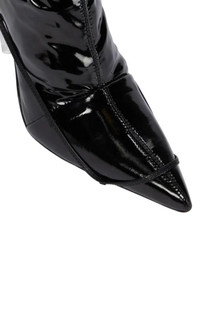 Peter Do fuses a modern silhouette with fetishistic undertones to create these black boots. Made from high-shine latex, they're set on transparent stiletto heels and arrives at an over-the-knee length. Exposed Zipper in Back Closed Toe Pointed Toe High Shine Latex Thigh High Clear Heel Fabric Tie at Ankle 3.75" Heel Height Material: polyester, leather Lining: leather Sole: leather Made in Italy