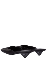 Prada Black Satin Mules Loafers Satin slip-on loafers in black Square toe Logo stamp at padded leather footbed Grained leather lining Logo-embossed varnished sculptural kitten heel Leather sole Heel 1.5" Upper: textile Sole: leather Made in Italy Have Questions about us, read our FAQ