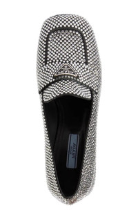 This loafer with triangle logo comes in satin covered in crystals that create plays of light and iridescent glimmers on the surface. Defined by a low heel and square toe, this shoe reimagines the classic penny loafer from a feminine perspective.. Crystal embellishment Logo plaque Round toe Branded insole Medium block heel Composition: Fabric 100%, Crystal 100% Lining: Leather 100% Sole: Leather 100%, Rubber 100% Made in Italy