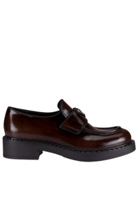 These loafers from Prada are bound to add a polished touch to your looks. Made from shiny brown calfskin leather, this pair features triangular logo insignia at the straps and contouring piping. Round toe Composition: calf leather Lining: leather 100% Sole: rubber 100% Designer colour name: Bruciato Fume Made in Italy