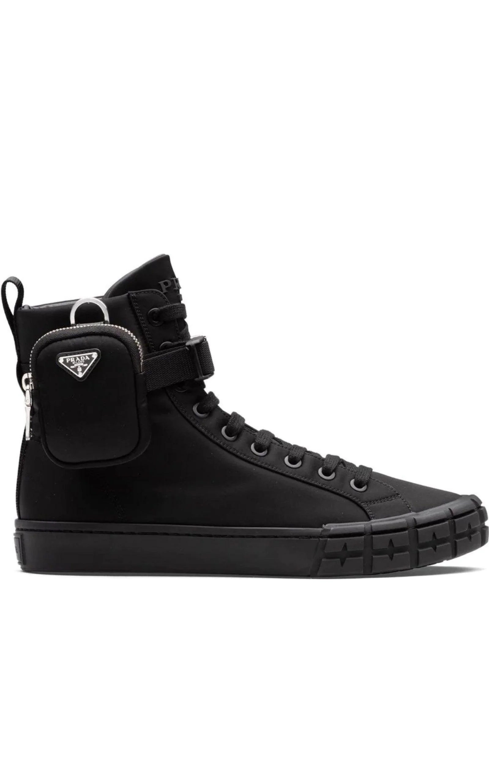 Detailed with removable pouch pockets, these high-top sneakers have been crafted from Re-Nylon for a more sustainable approach. Enamel triangle logo Logo-print tongue Ankle-length Round toe Front lace-up fastening Logo pull-tab at the heel Removable pouch Flat rubber sole Composition: Nylon 100% Lining: Leather 100% Sole: Rubber 100% 1 1/4" (32mm) heel; 1" platform (size 38.5) 5 1/4" shaft Made in Italy