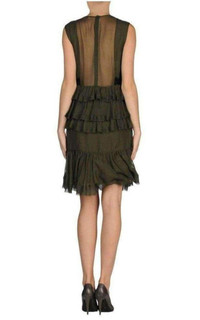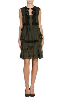 Sleeveless lace ruffles dress Black lace application Semi-lined interior Rear closure Zip closure Solid color- olive green Round collar Composition: 74% Silk, 19% Viscose, 7% Polyamide Lining 95% silk, 4% elastane Length from shoulder to hem: 38" Made in Italy