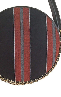 This burgundy and black Paco Rabanne chainmail drum bag has taken the label's iconic chain-mail dress design and converted it into a striking accessory. That classic design has been emulated here by decorating this leather and fabric drum bag with a series of metal disks connected by metal rings. Leather: Cowhide Gold-tone hardware Exposed zip at top Card slot at interior Flat shoulder strap Dust bag included Lined: Leather Width: 7"/18 cm, Height:7.5"/19 cm, Depth: 2"/4.5 cm Strap drop: 9.5" / 24cm Made in Italy