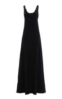 Crepe satin long dress Sleeveless Rounded neck Front fringes and brass piercing details Flared skirt with hem and back vent. 67% Acetate, 33% Silk Details: 100% Brass Made in Italy