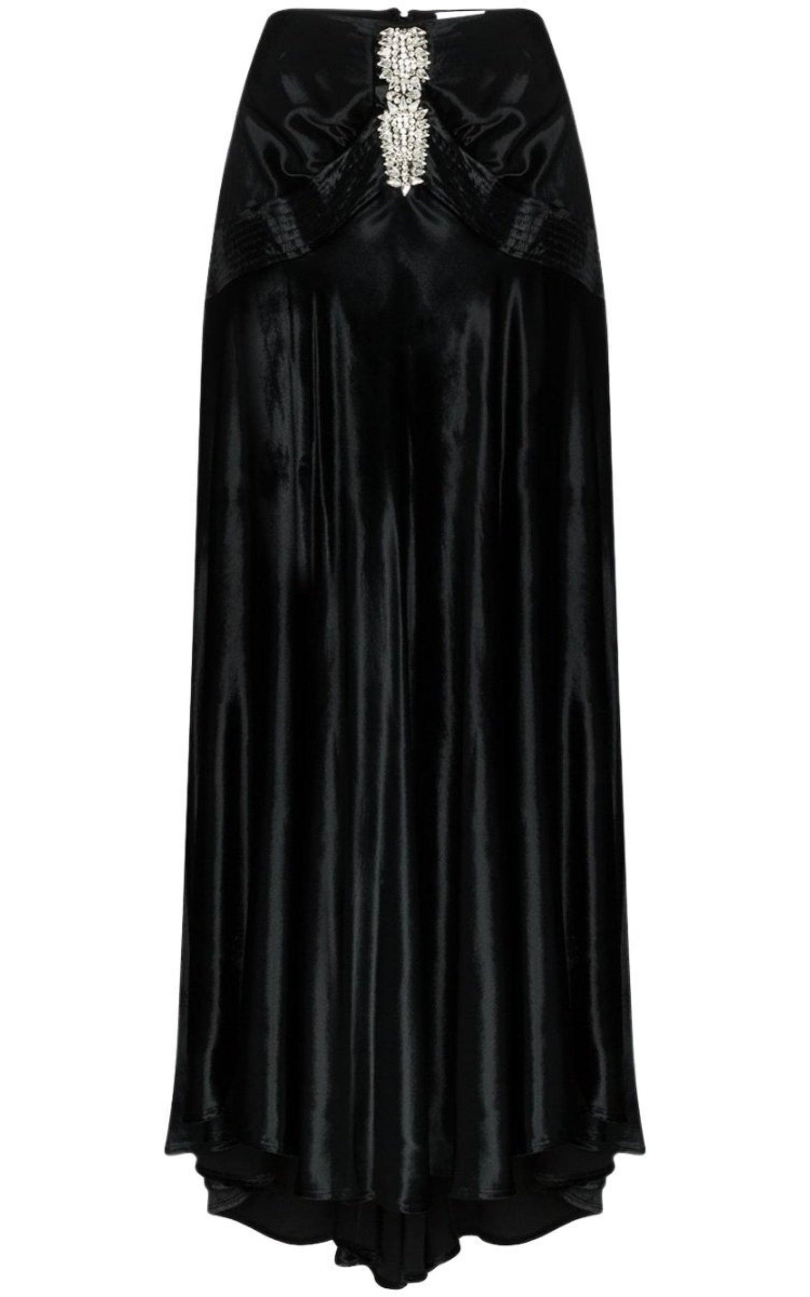 This black crystal-embellished flared maxi skirt from Paco Rabanne is sweeping, flowing and full of gothic romantic energy High waist Concealed fastening Flared style Long length Crystal embellished detail to the front. Composition: Viscose 100% Dry Clean Only
