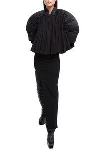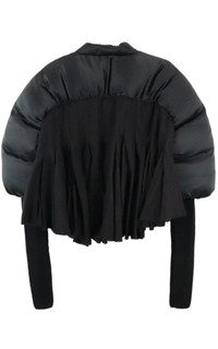 This Duvetessa jacket speaks to Rick Owens’ experimental aesthetic. It’s crafted from black shell and punctuated with pleated panels. Voluminous sleeves frame the boxy silhouette. black virgin wool/silk Padded panels Godet design Collarless V-neck Front press-stud fastening Puff sleeves Extra-long sleeves Ribbed cuffs Flared hem Cropped Composition: Virgin Wool 100% Lining: Cotton 97%, Elastane 3% Dry Clean Only Made in Italy