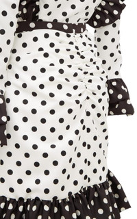 This Rodarte texture-rich skirt is made in the USA from polka-dot faille instilled with a hint of silk and embellished with contrasting ruffles and gentle gathers for volume, then lined with silk for added fluidity. Emulate the label's styling by wearing it with the matching shirt and heels. Color: White Composition: 90% polyester, 10% silk. Lining: 100% silk. Care: Dry clean Made in: USA Mid-weight polka-dot faille Black ruffles White lining Concealed back zip with gathers