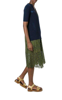 Unique, two-in-one dress and sweater, layered together in a sophisticated statement for day or occasion. Relaxed fit. Detachable sweater layer in mid-gauge cotton. Tonal grosgrain trim at sweater front. In-seam pockets at sweater's hip. Long vent at center back of sweater. Gathered elastic empire waist. Tonal grosgrain shoulder straps. Open-work eyelet trim throughout. Tonal cupro lining. Sweater: 100% cotton; Dress: 100% cotton; Dress Lining: 100% cupro. Made in Japan