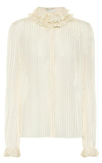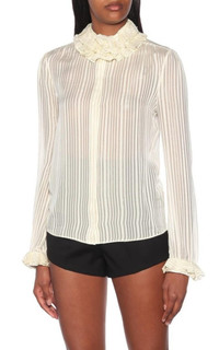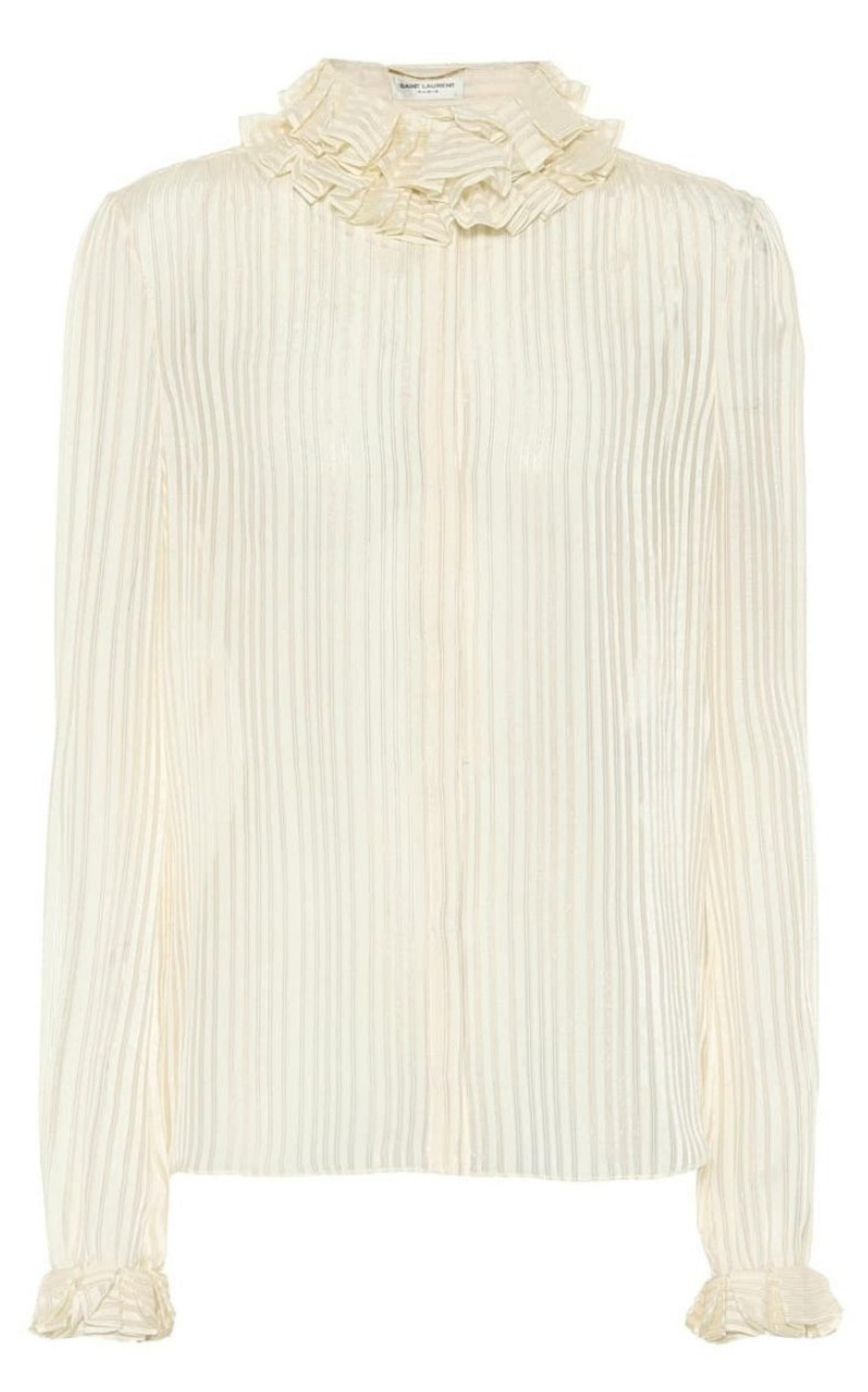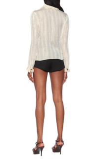This ivory-white top from Saint Laurent will be the conversation piece at your next dinner party. With a frilly pierrot collar, poet cuffs, and golden lamé stripes throughout, it's a striking design Vertical stripe pattern Metallic threading Ruffled detailing Long sleeves Concealed front button fastening. 96% silk, 4% metallic fibre Dry clean only Made in France