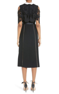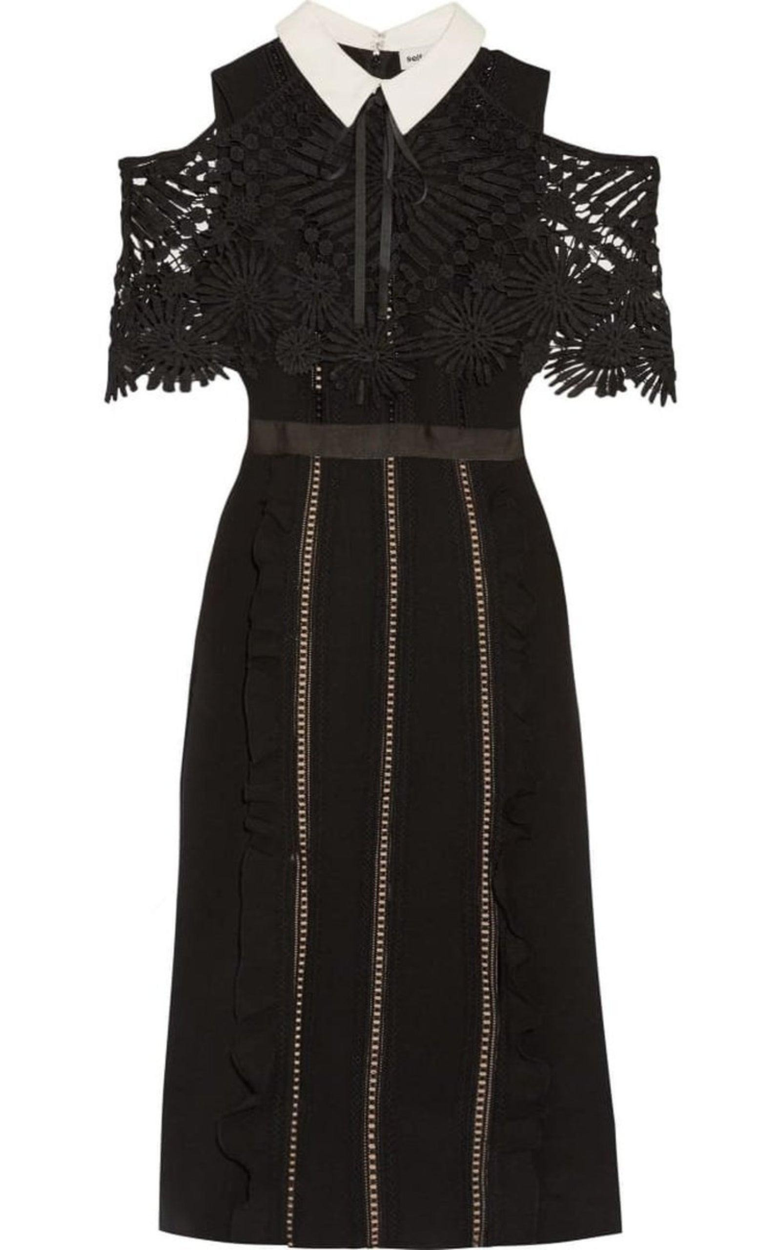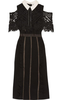 This 'Hinkley' design is cut from sculpting crepe with a contrasting white collar, guipure lace overlay and nipped-in waist. Lattice embroidery and ruffled trims enhance its feminine feel. Black crepe and guipure lace Concealed hook and zip fastening at back Fabric1: 76% polyester, 20% viscose, 4% elastane Fabric2: 100% polyester; trim: 99% cotton, 1% elastane Lining: 100% polyester Fits true to size Designed to be fitted at the bust and waist, slightly loose at the hip No bra is required due to the internal structure Mid-weight, non-stretchy fabric Dry clean
