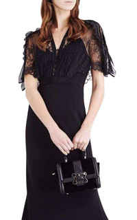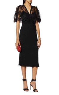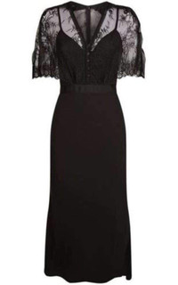 Modern femininity comes courtesy of Self-Portrait’s Mason midi dress. Perfect for party season, the nipped-in silhouette features a floral lace cape overlay trimmed with organza ruffles. Finished with a grosgrain waistband and decorative covered buttons. Concealed hook-and-eye and zip fastening at back. High neck, ruffled trims at shoulders. All-over contrasting diamond lace. Flounced hem, geometric lace trims. Bandeau lining at bodice, fully lined skirt. Shell: 64% polyester 36% polyamide. Lining 100% polyester. Cool hand wash.