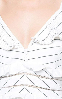 Al lover pleats Tiered ruffles Mesh cutouts at bodice Shoulder cutouts Stripe pattern Midi length V neck Short sleeves Hook-and-eye at back Hidden zip at back Lined Shell: 49% elastomultiester/48% polyester/3% viscose Trim: 100% polyester Lining: 10 0% polyester Dry clean