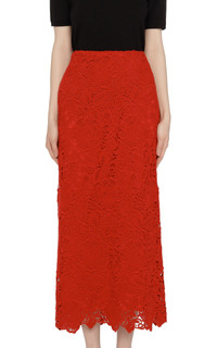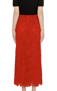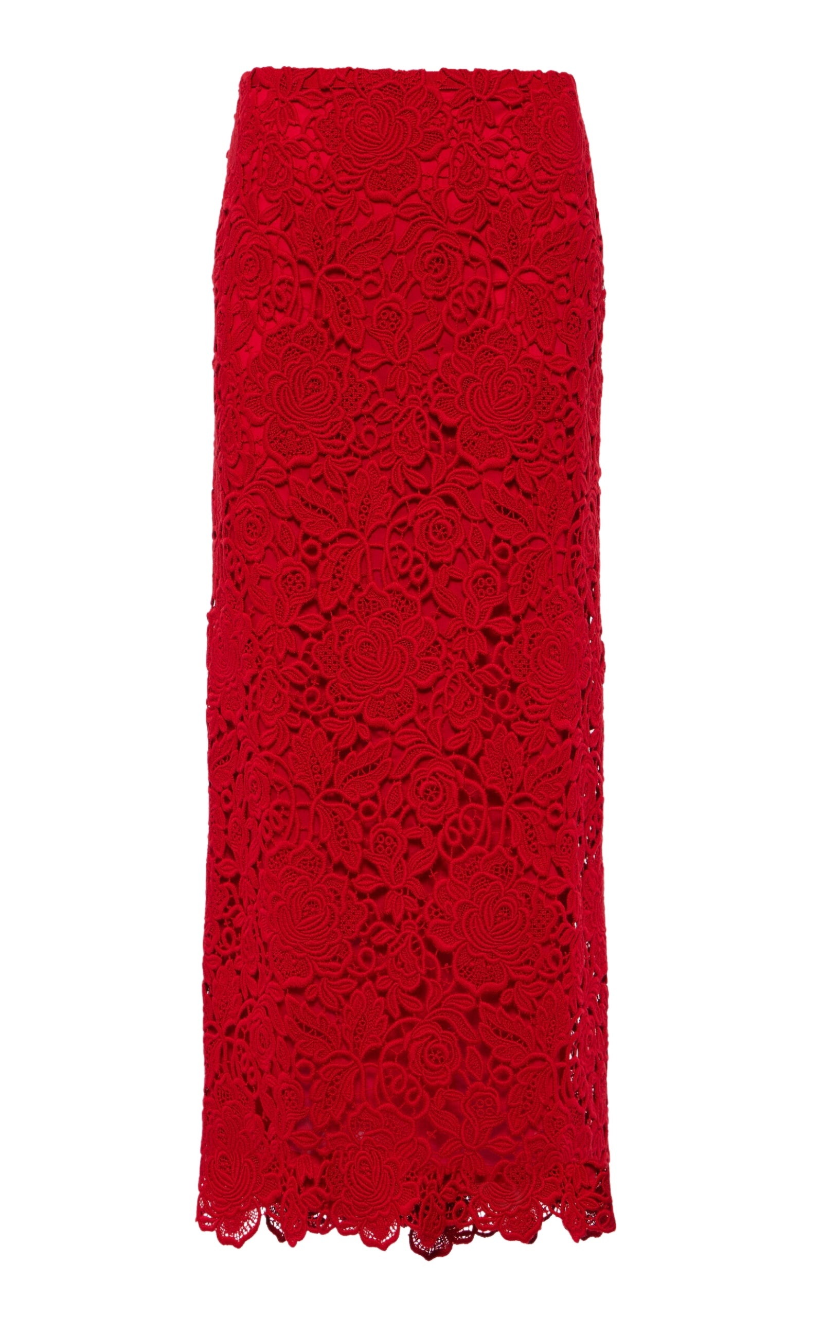 This Valentino pencil skirt is made from a wool-blend floral Guipure lace material and offers an elegant, straight silhouette. It has an invisible zipper-and-hook closure and a deep vent on the back. The scalloped hem adds a lovely touch, and the skirt comes with a removable underskirt that fastens with press studs. The back features a concealed zip closure. Central vent at back hem Full twill lining Supplier color: Rosso Composition: Acrylic45% Wool45% Polyester10% Lining: 91% viscose, 9% elastan Dry clean Made in Italy