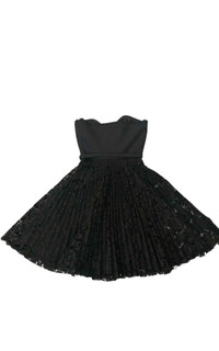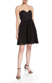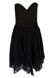Valentino cocktail dress. Fluttering lace skirt with sweetheart bodice Strapless sweetheart neckline Banded waist with self-tie bow A-line silhouette. Hem hits about at the knee. Concealed side zip Approx. 28"L from neckline to hem. Fabric1: 71% Cotton, 21%/Viscose, 8% Polyamide Fabric2: 65% Virgin wool, 35% Silk Fabric3: 100% Silk Lining: 91% Silk, 9% Elastan Made in Italy