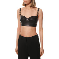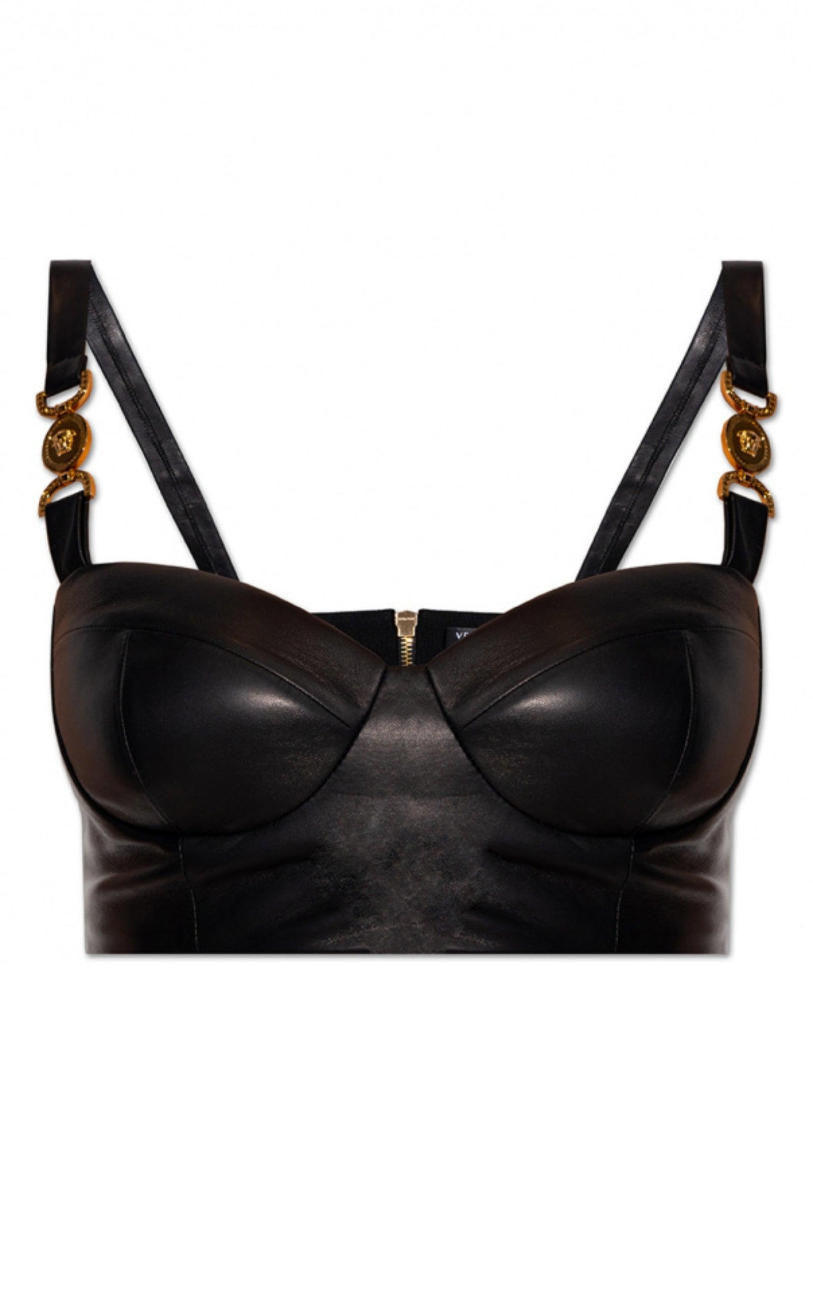 This bustier top from Versace is made from smooth lamb leather. It has shaped cups and Medusa hardware detailing on the shoulder straps. Padded top Padded cups Zipped back Fitted Cropped Material: 100% lamb leather Material II: 86% viscose, 10% polyamide, 4% elastane Lining: 75% acetate, 25% silk Do not clean True to size Made in Italy
