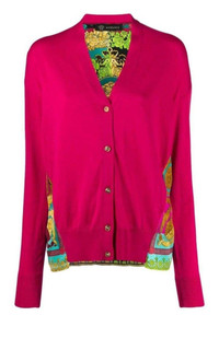 This pink cotton and silk Medusa print cardigan from Versace features a front button fastening, long sleeves, a knitted style, a v-neck and a ribbed hem and cuffs. Silk 57%, Cotton 43% Dry Clean Only Made in Italy