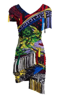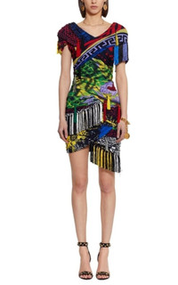 An explosion of personality, the Versace way is always innovative, with a plethora of colors and prints that are not afraid to Mix and Clash. Mega Mix print Short sleeve V-neck Enriched with embroideries and fringe detail. Outside: 100% Viscose Lining: 100% Viscose Trim: 100% Acetate Embroidery: 100% Acetate Delicate dry clean Made in Italy