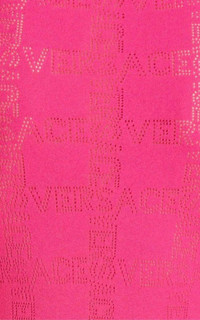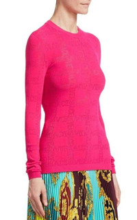 Fuchsia slim fit knitted sweater from Versace Long sleeves Crew neck Fitted silhouette Ribbed hem and cuffs Knitted logo pattern. Construction: Viscose 83%, Polyester 17% Made in Italy
