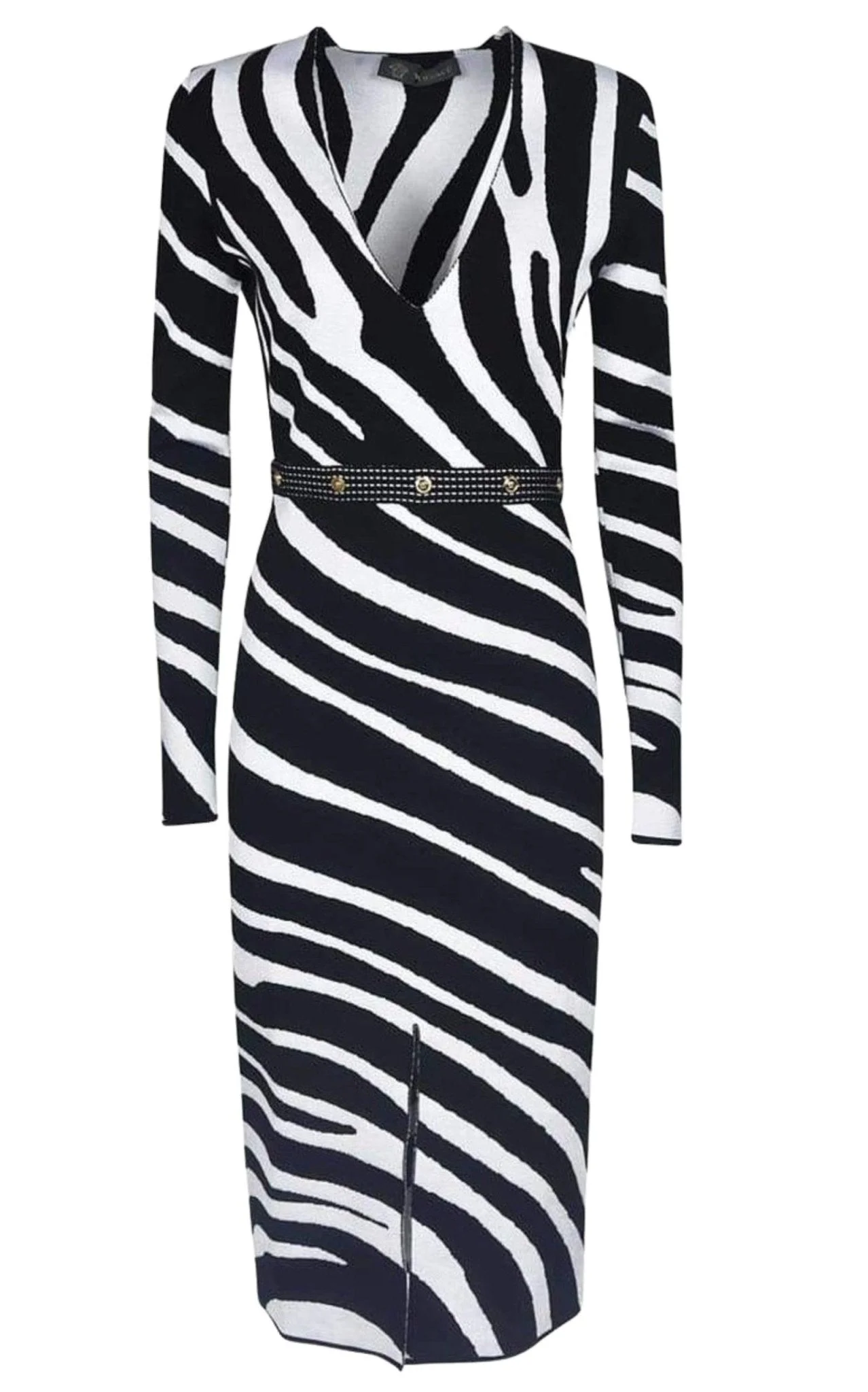 The Zebra Print Sweater Dress from Italian fashion brand Versace features medusa-head buttons around the waist, a deep v-neckline, and a front vent. Long Sleeves Unlined 75% Viscose, 13% Nylon, 11% Wool, 1% Elastane Dry Clean Only Made in Italy