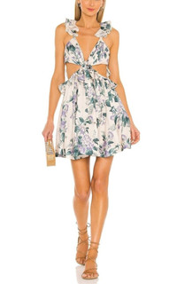 All-over floral print Sleeveless Ruffled detailing V-neck Bow detailing Cut-out detailing Hidden back zipper closure Flared Composition: Linen/Flax 100% Lining: Cotton 100% Dry Clean Imported
