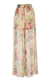 Garden Party Florals. Muted florals cover sheer wide leg pants. Elasticized drawstring waist. Pull-on style. Waist slant pockets. Wide leg silhouette. Partially lined. Sheer. Rise, about 12". Inseam, about 30". Silk. Dry clean.