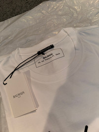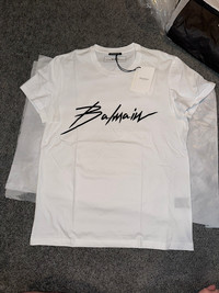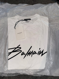 BALMAIN Signature Logo White T Shirt - Brand New With Tags! Original MSRP: $650.00 before tax! RH01601/133 As we have always believed, style is saying who you are without having to speak and a Balmain T-shirt says it all. Designed by Mr Rousteing, this statement logo top is an indispensable wardrobe addition. Over 70 years since Pierre Balmain established his namesake house, wunderkind Olivier Rousteing continues to champion an aesthetic built on powerful silhouettes and tough-luxe detail. Through statement shoulders, signature hardware and high-octane embellishments, the brand transforms classic T-shirts, denim and moto leathers into treasured trophy pieces. White signature logo T-shirt Round neck Logo appliqué Short sleeves Relaxed fit Straight hem Machine wash Fits true to size 100% cotton