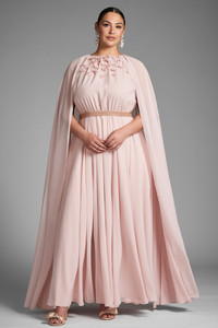 Online Exclusive Layers of peachy petal pink chiffon make this gown diaphanous, made to look as though it is floating. An attached single layer of chiffon creates a full slit sleeve cape covering the shoulder and adding drama. At the front hand made 3D embroidering and a beaded slim belt. This gown was made to make a statement of sheer elegance. Details: - Model is 5'11" Wearing A Size 2 - Full-Length, 60" from top of shoulder to bottom hem - Silk Chiffon - 100% Polyester - Imported - Style #S231G21F-532