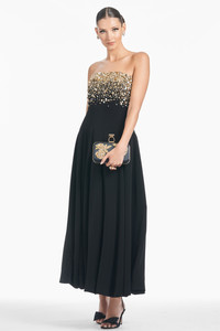 Bettany is a special case of classic meets statement. She's a full-length, black strapless gown with our signature touch of glamour. The bodice features gleaming gold embellishment that catches the light in all the right ways, cascading down in the most elegant, ethereal way. Prepare to turn heads with this piece. Details: - Model is 5'10" wearing size 2 - Full-Length, 60" from top of shoulder to bottom hem - 53" in Front Length - Back Zipper - No Pockets - Light Stretch Crepe - 100% Polyester - Imported - Style #F243G26-001