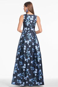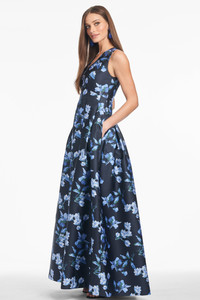 The Brooke is our V-neck gown with box pleats, peaked waist seam, and side pockets. This dress is what we consider to be a classic, essential silhouette, a perfect canvas for our most breathtaking prints. As always, our prints are exclusive to Sachin&Babi and created by our design team, ensuring you will not see them anywhere other than in our Collection. Details: - This Is Intended To Be A Full-Length Gown - Model is 5'10" wearing size 2 - Length of Garment, 61 1/2" from top of shoulder to bottom hem - Back Zipper - Full Lining - Pockets - Printed Mikado - 100% Polyester - Imported - Style # S251G56-418