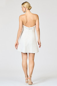 The Daphne Dress is a modern take on classic tweed, shot through with subtle metallic threads and added sequins for a hint of luminosity. This strapless structured mini silhouette skims the body with clean lines and finishes just above the knee for a chic, polished look. At the neckline, tonal hand-beaded embellishment adds dimension and a touch of sparkle, while the sleek construction and understated palette make this a versatile option for cocktail events, bridal events, or special moments. Fully lined for comfort. Details: - Model is 5'10" wearing size 2 - Length of Garment, 34" from top of shoulder to bottom hem - Back Zipper - Full Lining - Bonning - Horsehair - No Pockets - Sequins Tweed - 100% Polyester - Imported - Style #F251B02-106