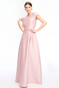 Effortlessly poised and unmistakably polished, the Mikado Blythe gown is a modern ode to classic femininity—reimagined with a touch of refined glamour. Rendered in an ethereal shade of rose quartz, the silhouette is quietly regal, featuring a gently tailored bodice, delicate cap sleeves, and soft pleating that flows into a full A-line skirt. At the heart of its elegance lies a showstopping crystal-encrusted neckline, an exquisite detail that catches the light with every movement, adding a radiant focal point to an already graceful design. This shimmering embellishment elevates the gown’s timeless shape with a whisper of opulence, making it a striking choice for the modern romantic. Details: - This Is Intended To Be A Full-Length Gown - Model is 5'10" wearing size 2 - Length of Garment, 61 1/2" from top of shoulder to bottom hem, Plus size 62 1/2" - Back Zipper - Pockets - Full lining - Self belt - Solid Stretch Mikado - 97% Polyester 3% Spandex - Imported - Style # F252G09-680
