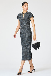 The Liz Dress brings structure and sparkle in equal measure. Crafted in Obsidian Frost tweed, this sleek, tailored silhouette is softly shaped through the body and finished with a subtle slit at the neckline. The collar is gently embellished for a hint of shine—just enough to elevate, never overpower. A polished choice for both daytime occasions and dressed-up evenings. Details: - Model is 5'11" wearing size 2 - Length of garment, 48" from top of shoulder to bottom hem - Full lining - Back zipper - Back vent - No Pockets - Tweed - 100% Polyester - Imported - Style # R261D07-001