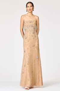 Vienna captures quiet romance in every detail. This strapless gown is crafted in sheer Indian tulle and intricately hand-embellished with delicate silver floral motifs, giving it a weightless, celestial shimmer. The sleek column silhouette elongates the figure while allowing the embroidery to float effortlessly across the body. Soft and graceful, Vienna is a natural choice for formal soirees, weddings, or any moment that calls for understated opulence. Details: - This Is Intended To Be A Full Length Gown - Model is 5'11" wearing a size 2 - Full-Length, 60 1/2" from top of shoulder to bottom hem - Back Zipper - Full Lining - No Pockets - Indian Tulle - 100% Polyester - Imported - Style # R261G43-260