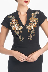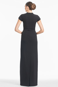 The Hudson Gown has arrived, embodying quiet luxury and timeless style. The floor-length silhouette is inspired by the impeccable tailoring of a "shirt style" fit. The incredibly flattering silhouette is made exquisite with the gold embellishment throughout the bodice. Details: - Model is 5'10" Wearing A Size 2 - Full-Length, 60" from top of shoulder to bottom hem - Plus size 62" - Back Zipper - No Pockets - Crepe - 88% Polyester - 12% Polyurethane - Imported - Style #R251G12-001