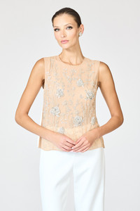 The Iris Top in Nude is the epitome of delicate artistry and modern femininity. Crafted in sheer nude tulle, it features an exquisitely embroidered overlay of tonal floral motifs, each traced with shimmering silver sequins and faceted beads for radiant sparkle. It is artfully embroidered by our 3rd generation artisans at our family-owned atelier in Mumbai. The sleeveless, gently boxy silhouette drapes with effortless ease, making it perfect for pairing with tailored trousers or skirts. Romantic, sophisticated, and undeniably eye-catching, Iris is designed to bring refined glamour to any occasion. Details: - Model is 5'10" wearing size S - Full-Length, 23 3/4" Length on Body - Back Key Hole - Tulle - 100% Polyester - Stretch Crepe (Satin Back) - 30% Recycled Polyester, 68% Polyethylene, 2% Polyurethane - Imported - Style #F251B06-251