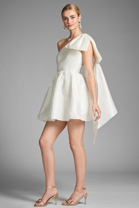 A mini dress with maximum impact: introducing the Kelsi Dress in Ivory. This cutie features a one-shoulder design adorned with an oversized bow and a train to follow. She's sweet, special, and sure to be a summer closet staple for bridal moments and beyond. Details: - Model is 5'11" wearing a size 2 - 33" Long - Side Zipper - Dupioni - 100% Polyester - Imported - Style #T241B13-103
