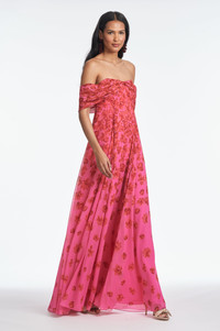 The Kennedy Gown is a study in modern romance. Designed with a graceful off-the-shoulder neckline and a softly sculpted silhouette, this gown moves with quiet drama and undeniable elegance. The delicately faded floral motif adds depth and artistry, while the airy, fluid fabric ensures every step feels effortless. Perfect for any occasion that calls for refined glamour. As always, our prints are exclusive to Sachin&Babi and created by our design team, ensuring you will not see them anywhere other than in our Collection. Details: - This Is Intended To Be A Full-Length Gown - Model is 5'11" wearing size 2 - Length of Garment, 61 1/2" from top of shoulder to bottom hem - Back Zipper - Full Lining - No Pockets - Printed Chiffon - 100% Polyester - Imported - Style # T251G72-667