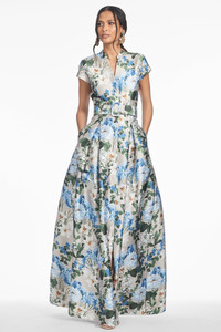 Make no mistake, the Marta Gown is no wall flower. She is the epitome of timeless, elevated personal style and quiet luxury. The fit and print are everything. The floor-length silhouette is partially inspired by the impeccable tailoring of a "shirt style" fit. This incredibly flattering body finds its way into our Dune and Dusk Petals print. A banded collar is tastefully cut away to meet concealed front buttons. Our Mikado fabric with the mono-color florals make this dress a classic and a statement all at once. As always, our prints are exclusive to Sachin&Babi and created by our design team, ensuring you will not see them anywhere other than in our Collection. Details: - This Is Intended To Be A Full-Length Gown - Model is 5'11" wearing size 2 - Length of Garment, 60" from top of shoulder to bottom hem - Functional Front Placket - Full Lining - Separate Belt - Pockets - Printed Mikado - 100% Polyester - Imported - Style # T251G19-289