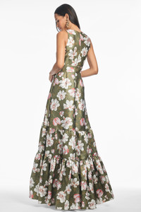 Rori is not for those looking to blend, she is a show-stopping conversation piece. A clean a-line silhouette with deep v-neckline is punctuated through tiers of our moss green magnolia print. Featured in our non-stretch Mikado, she is designed to fit and flatter, cinching at the highest point of the waist and elegantly falling at the hip. As always, our prints are exclusive to Sachin&Babi and created by our design team, ensuring you will not see them anywhere other than in our Collection. Details: - Model is 5'10" wearing a size 2 - Full-Length, 60" from top of shoulder to bottom hem - Back Zipper - Printed Mikado - 100% Polyester - Imported - Style #F231G06-381