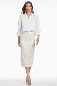 Another Pencil Skirt...not really. Our mesh sequin skirt is a year-round luxe option. For spring and summer pair back to the Luce top and our linen blazer, and once the cold weather comes, fabulous paired with your favorite winter white cashmere and camel boot. Details: - Model is 5'11" wearing a size 2 - Back Zipper - Sequins On Mesh - 95% Polyester 5% Spandex - Imported - Style # T251S02-104