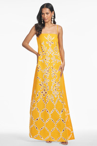 Sianna is something to behold. In our beautiful Marigold yellow, this maxi dress is beyond expectations. The all-over embroidery of the gown designed in-house, is masterfully made possible by our 3rd generation artisans at our Atelier in Mumbai. One imagines the most glamorous of summer day events or elegantly romantic evening illuminated with twinkling lights and sweet summer cocktails. Details: - Model is 5'11" wearing size S - Full-Length, 56" length on body - Elastic Back - Adjustable Straps - Full Lining - Side Zipper - Linen Rayon - 57% Linen 43% Rayon - Imported - Style # T251G21-722